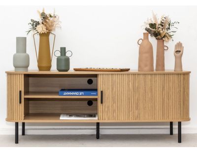 Avec des pieds en métal noir élégant et des façades composées de lamelles verticales en bois, les meubles Kyoto insufflent un charme moderne et intemporel à votre intérieur.