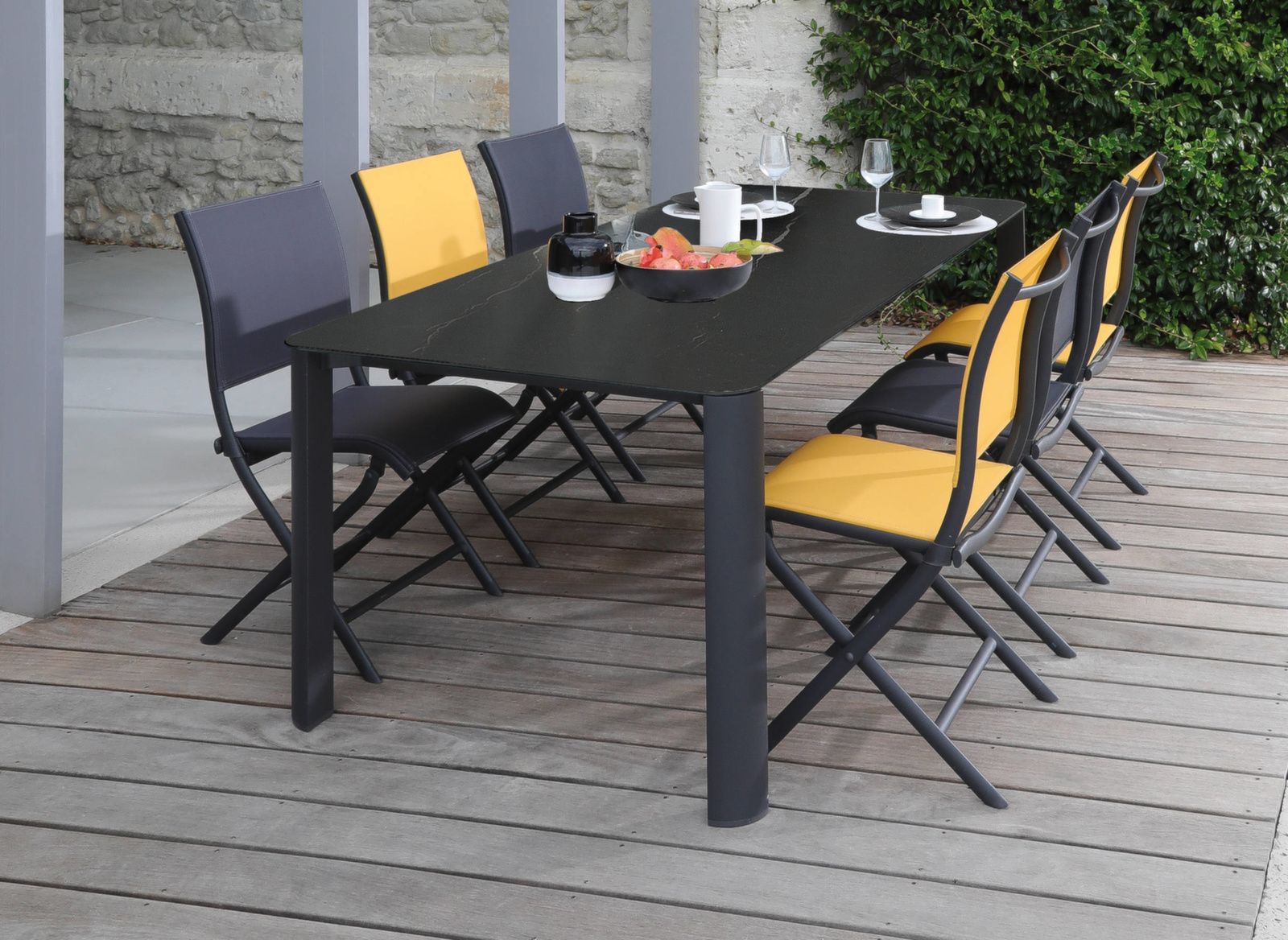 Sur du mobilier de jardin il est important de privilégier le confort. C’est un espace où la détente à toute sa place. Privilégiez des modèles avec accoudoirs pour vos assises. Pour compléter une table à manger, nous apprécions la simplicité des lignes du modèle Modulo, alliée au confort de l’assise en polyester tressé.