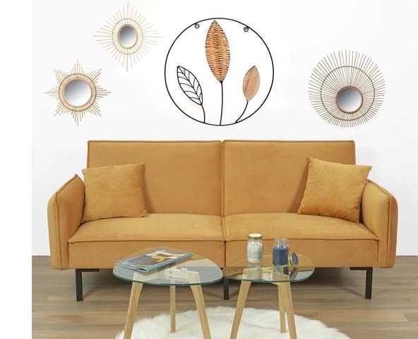 Notre conseil déco : sur un grand mur de couleur claire, mariez une grande décoration murale en métal et rotin avec plusieurs petits miroirs en rotin tout autour, accrochés en quinconce. Au-delà de l'aspect esthétique, un mur ainsi décoré donne de la perspective et de la luminosité à votre pièce.