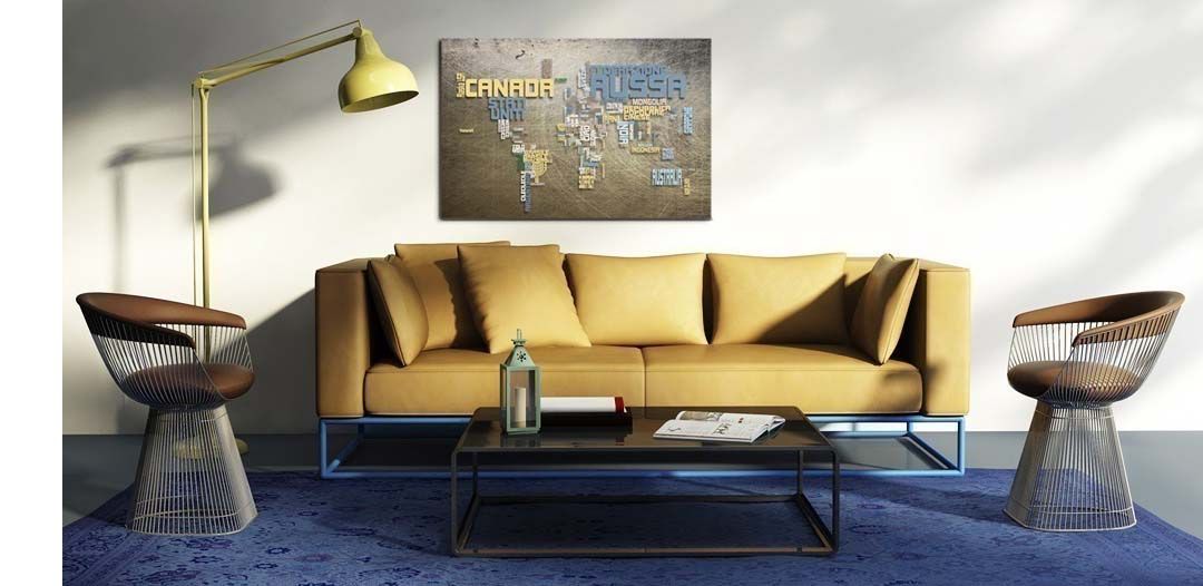 Les couleurs bleu et jaune, se déclinent sur un fond brun. Cette grande toile murale mappemonde d’1,20 mètre habillera et réchauffera un grand mur vide.
