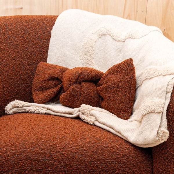 Ajoutez une touche de modernité et de chaleur à votre intérieur avec ce coussin en forme de nœud. Sa texture bouclette marron et son design original en font une pièce idéale pour compléter une décoration cosy et tendance.