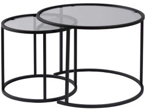 Ensemble de 2 tables gigognes rondes en métal et verre Aurum (Noir avec verre gris)