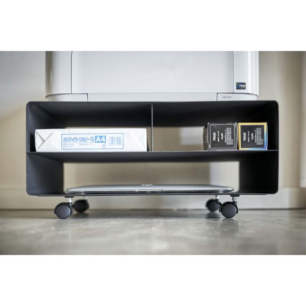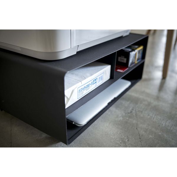 Organisateur très pratique avec ses spacieuses encoches de rangement .J'ai tout sous la main il est posé sur un coin de mon bureaux, Je peux y ranger une rame et demi de papier photocopie dans une encoche , les cartouches, des documents... Ca me libère de l'espace par ailleurs. Il est en métal très robuste avec une ligne simple très design .Mon imprimante Epson tient à l'aise sur le plateau. Ce support correspond à ce que que je recherchais. Je suis ravie de l'avoir trouvé.