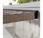 Structure 5 x 3.5 m ; Poteaux de 24 x 18 cm et 2 gouttières intégrées dissimulées dans la poutre et les poteaux ; Toiture en polycarbonate de 3 mm