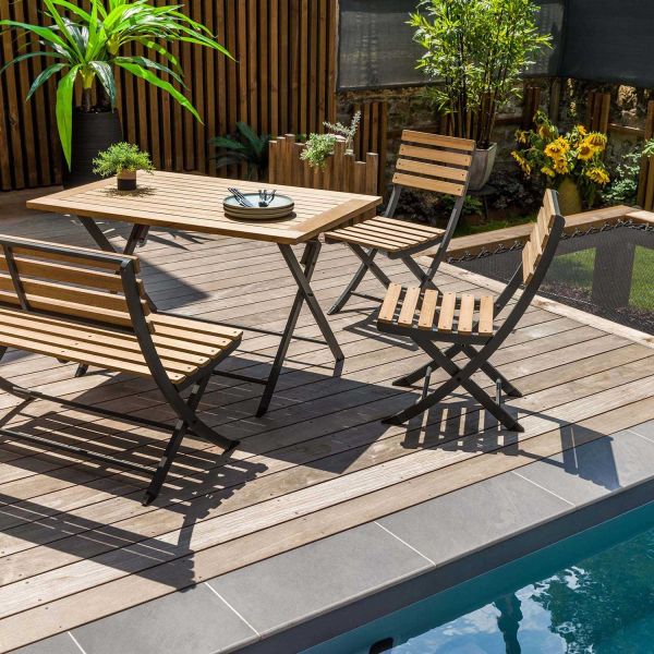 Pour vos repas en famille ou entre amis, optez pour nos salons de jardin dinatoires en bois, avec table simple ou extensible et chaises de salon de jardin en bois assorties. Ces modèles vous permettent d'accueillir confortablement de 2 à 10 personnes pour vos repas en extérieur. Nous proposons aussi des ensembles tables de jardin avec bancs pouvant accueillir jusqu'à 8 personnes sur une terrasse à la superficie moyenne. Pour les espaces réduits, nos salons de jardin pliables en teck ou pin sont facilement repliables et stockables pour ne pas prendre de place lorsque qu'ils ne sont pas utilisés.